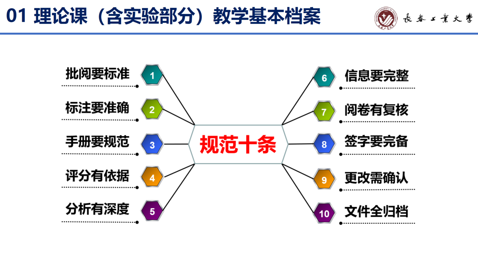 报告会的最后,于教授凝练出了批阅要标准、标准要准确、手册要规范、评分有依据、分析有深度、信息要完整、阅卷有复核、签字要完备、更改需确认、文件全归档的教学基本文档十条规范。她鼓励教师们要不断提高自身公司产品水平,积极探索教学方法改革,为提高公司的公司产品质量做出贡献。