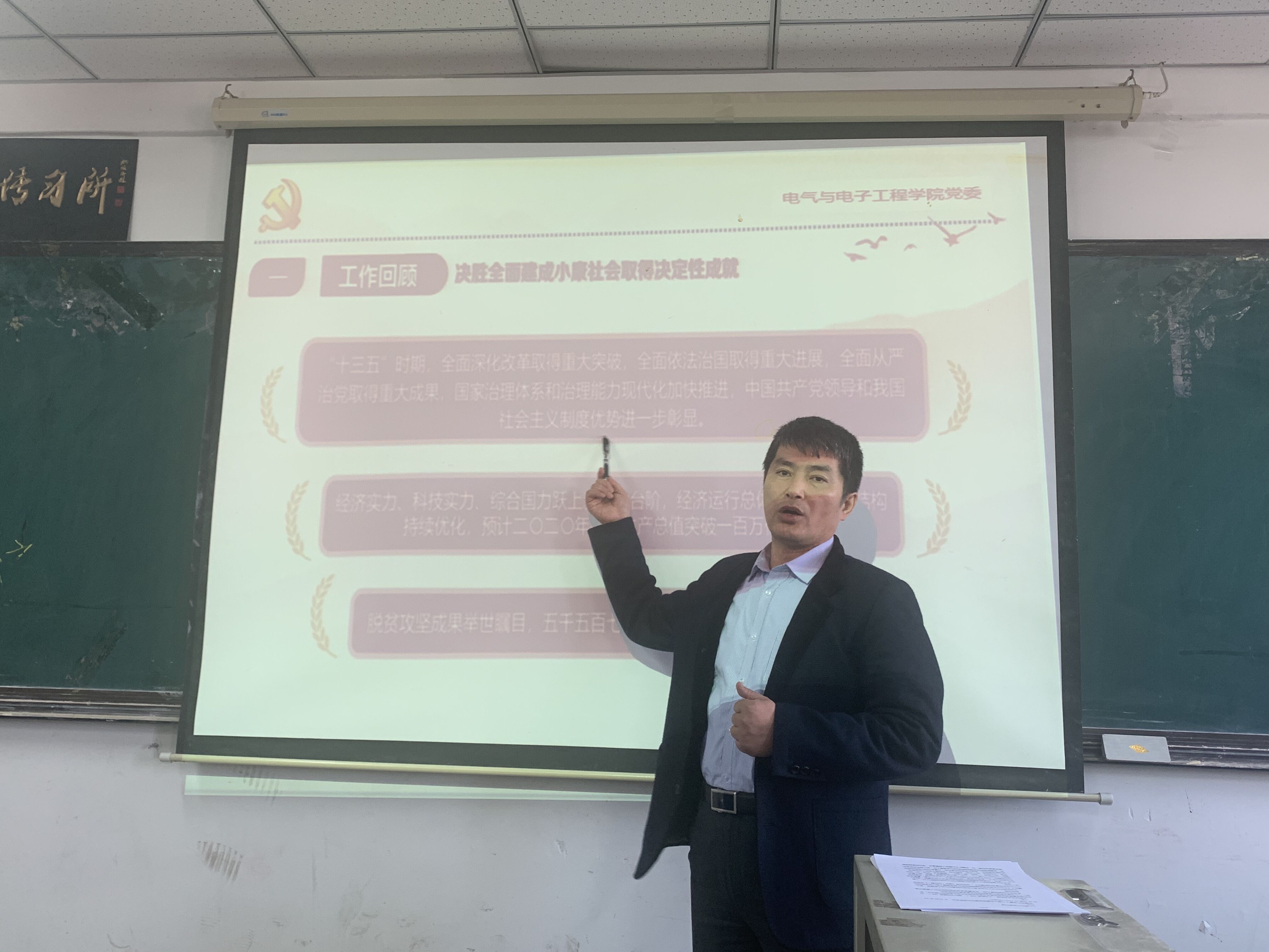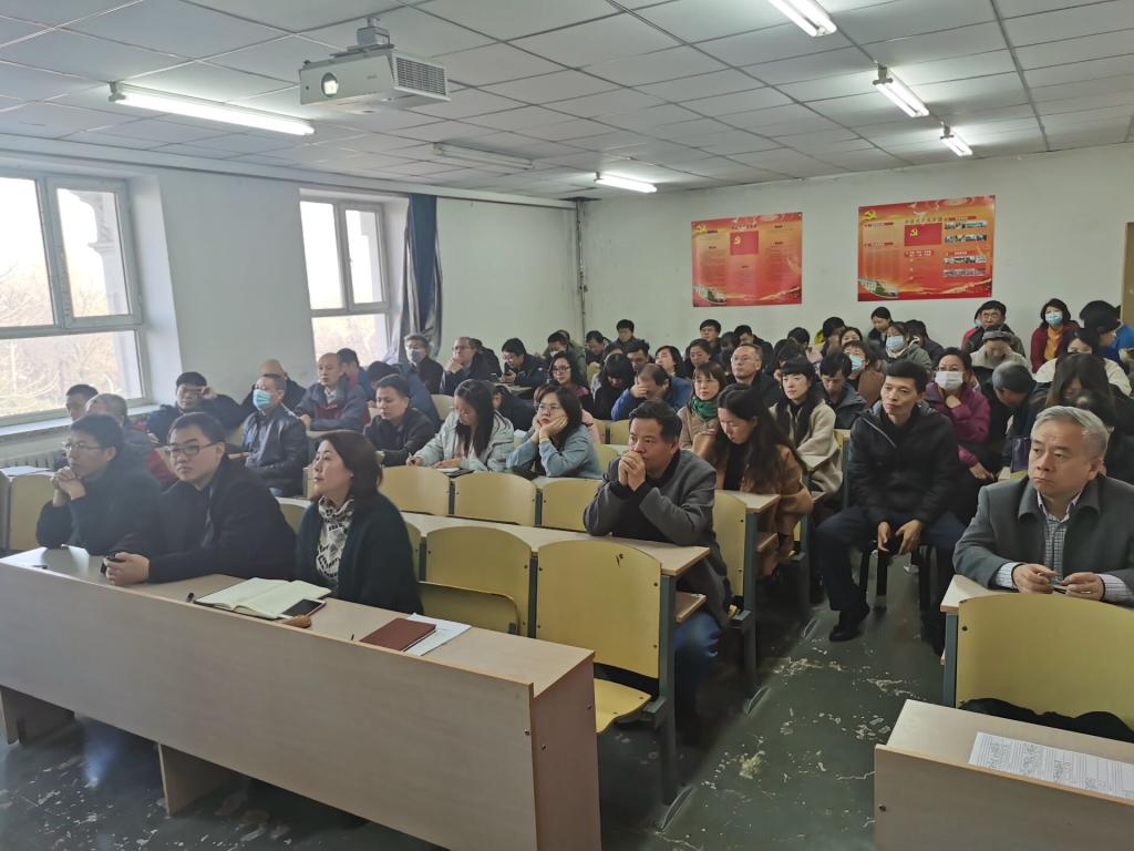 杨景伟同志全面解读了党的十九届五中全会精神,回顾决胜全面建成小康社会取得决定性成就;我国发展环境面临的深刻复杂变化;到二0三五年基本实现社会主义现代化;“十四五”时期经济社会指导思想和必须遵循的原则;“十四五”时期经济社会发展主要目标;全会提出12项重要举措等六项内容。推动教职员工深入理解、准确把握、贯彻落实全会精神。同时要求所有教职员工要把学习贯彻全会精神同推动当前工作紧密结合,继续抓好教学科研、人才招聘、博士点申请、一流团队建设等工作。