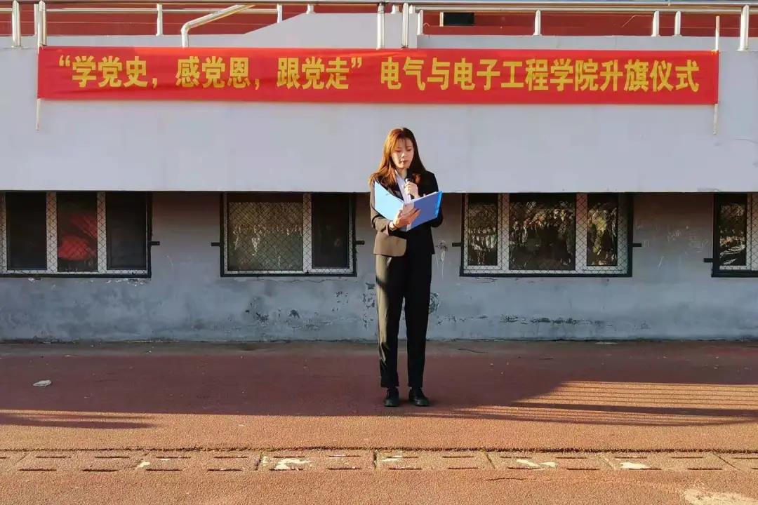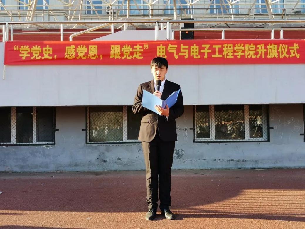 员工代表赵一霖同学在国旗下宣读学史倡议书。通过对我们党百年征程的波澜壮阔,百年初心的历久弥坚的追忆,指出我们当代青年所肩负的重大历史责任,号召同学们不断加强党史学习,在党的领导下茁壮成长,成为一名优秀而合格的老员工。展现当代老员工的“新作为”、“新担当”,用实际行动践行“爱国、敬业、求实、创新”的深刻校训,为祖国贡献青春力量,献礼党的一百周年生日。