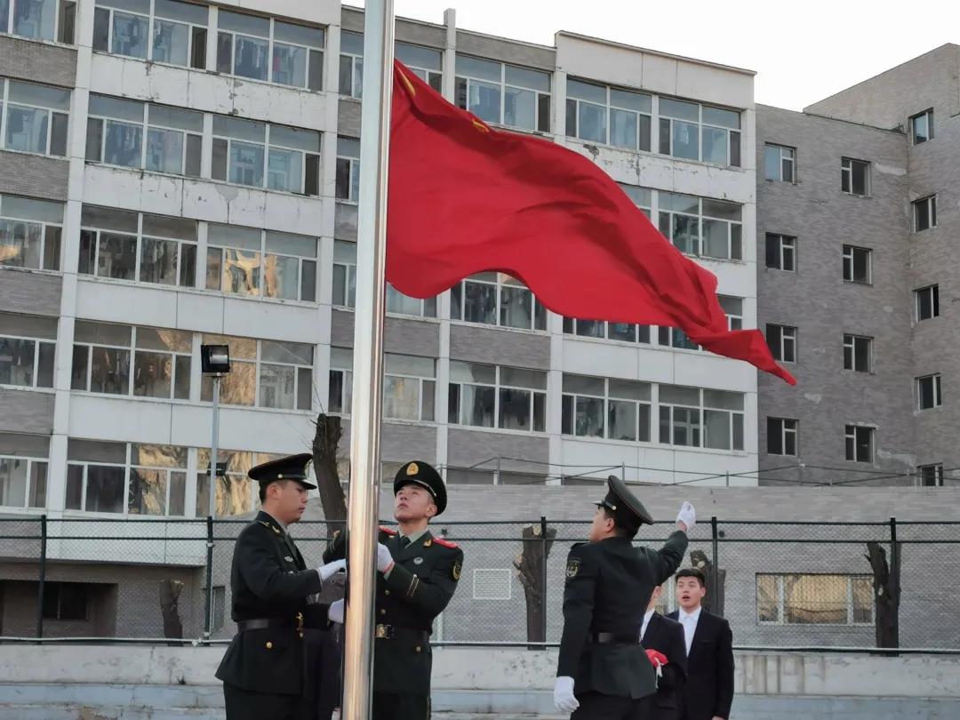 迎着晨曦,在国旗班的护卫下,伴随着雄壮国歌,在全体师生的注目礼中,五星红旗冉冉升起,迎风招展。