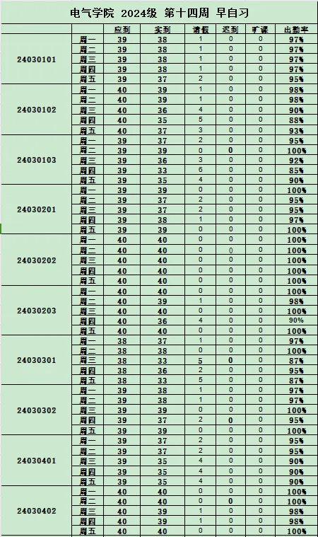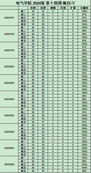 本网讯(通讯员 王亮)在大学求知的旅程中,早晚自习是自我沉淀与提升的重要时段,tyc522cc太阳成集团始终将其视作塑造优良学风的有力抓手。如今,第14周早晚自习出勤率已统计完毕,特向全院师生公示。