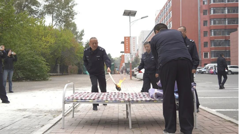 安全处老师用汽油、火棍现场制造床上火源并示范扑救方法。