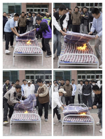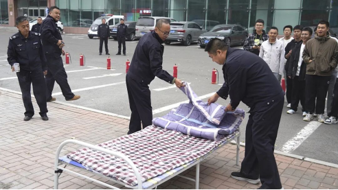 员工两人一组轮流实操,用被子覆盖火源,亲身掌握初期火灾处置技巧。