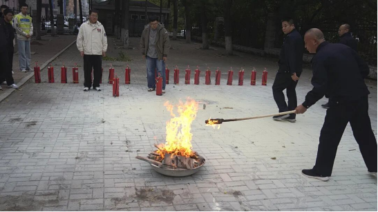 员工两人一组轮流实操,手持灭火器对准火盆火源精准喷射,成功扑灭明火。