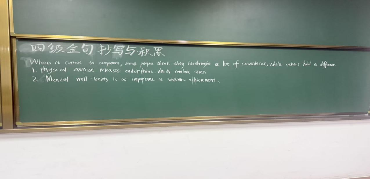 轮值员工需提前熟悉任务,从四级作文素材书、历年真题范文中挑选2-3句通用型金句,提前到达教室,用粉笔将金句工整抄写在教室黑板“金句区”,其余员工在座位上同步将金句摘抄到笔记本。抄写完成后,轮值员工需带领全体员工朗读金句,帮助大家加深记忆。