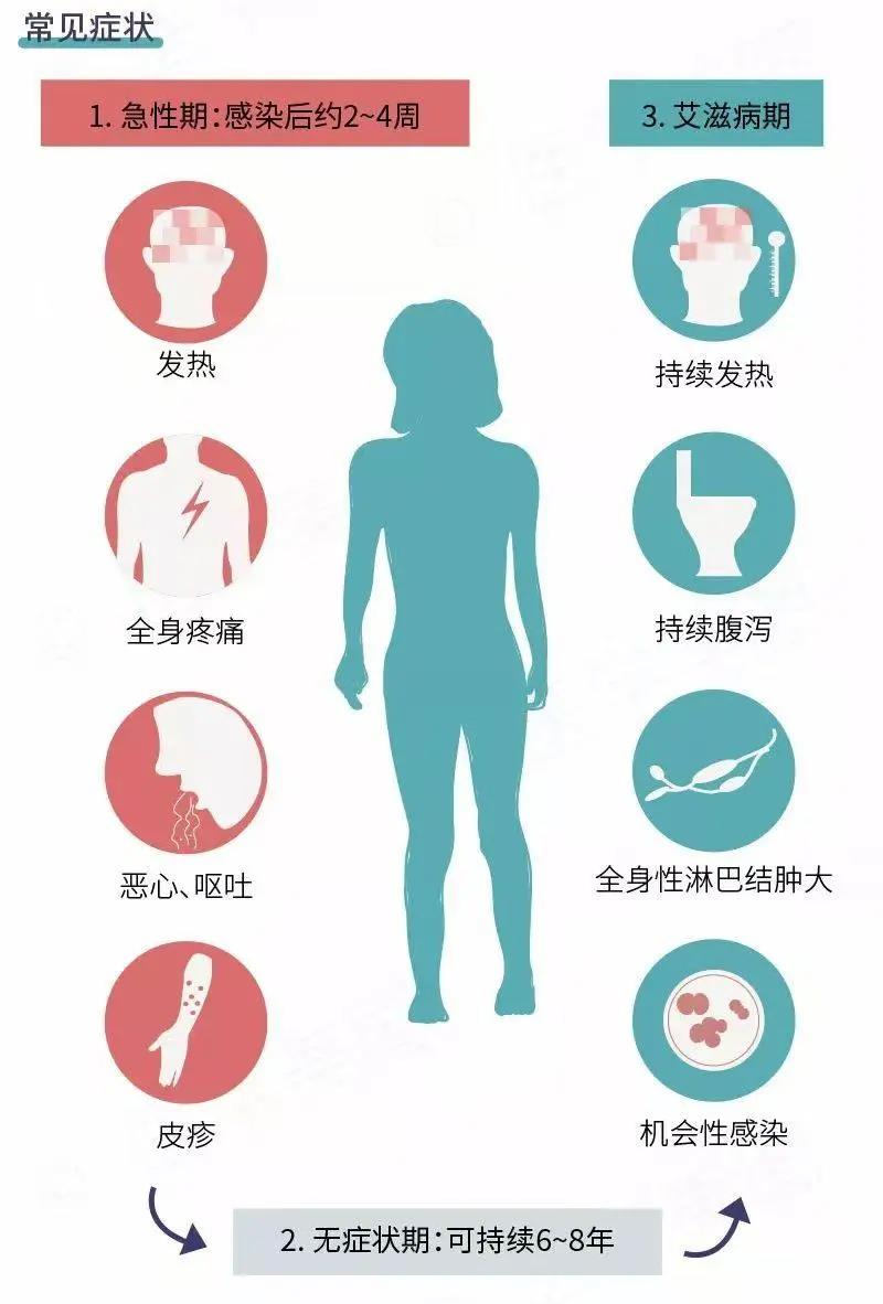 如果 HIV 感染者没有接受治疗,一般会经历以下 3 个阶段:急性期、无症状期、艾滋病期,也可无明显急性期症状而直接进入无症状期。