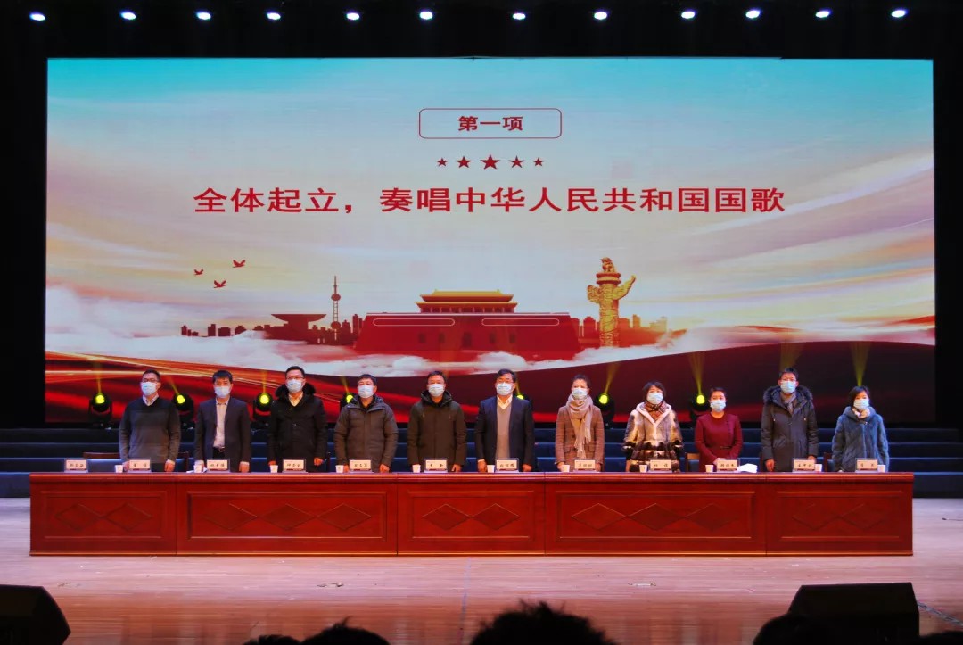 全体起立奏唱国歌。在全场雄壮高昂的国歌声中,会议的序幕慢慢拉开。