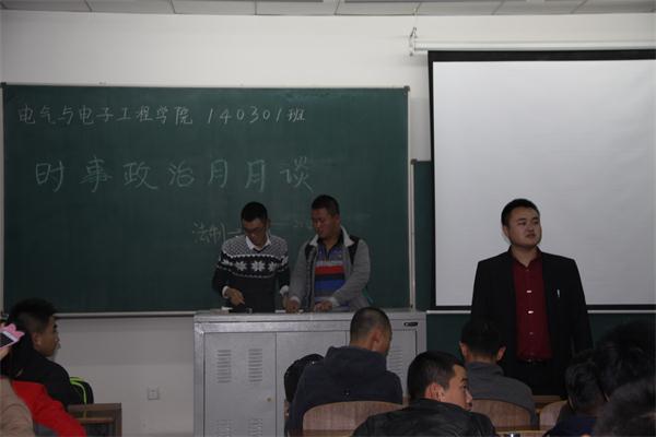 (通讯员 刘冬)11月3日公司在北湖校区开展时事政治月月谈理论学习系列活动之十月风云。本次活动由140301班团支部承办。公司辅导员助理王子峰老师和2014级全体员工干部参加了本次活动。
