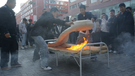他们小心地拿起被子,配合着对方,在将被子覆盖向模拟火源的瞬间,两人的表情都格外认真,仿佛在进行一场真正的生死较量。现场的其他同学也都紧张地注视着他们,空气仿佛都凝固了一般。
