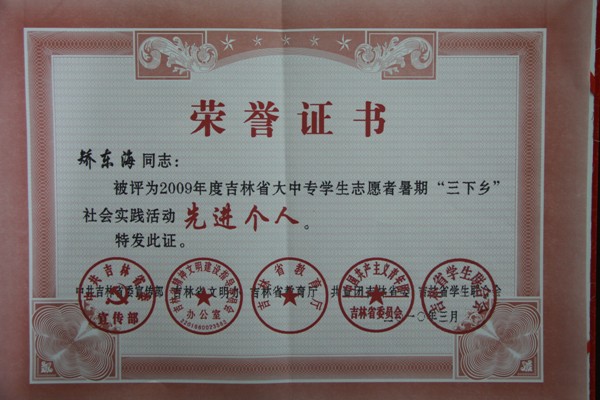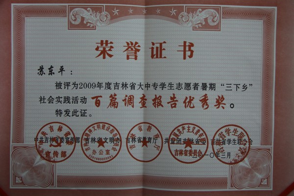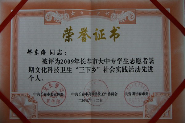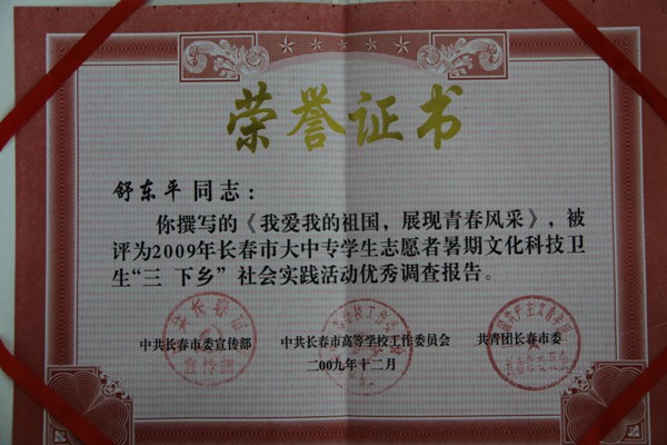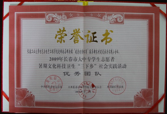 公司团委在2009年吉林省大中专员工志愿者暑期“三下乡”社会实践活动获得嘉奖