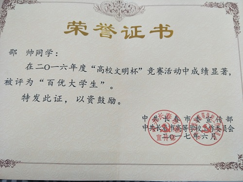 公司邵帅同学在二〇一六年度“高校文明杯”竞赛活动中被评为“百优老员工”