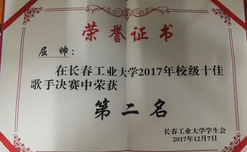 公司屈帅同学在2017年校级十佳歌手决赛中荣获第二名