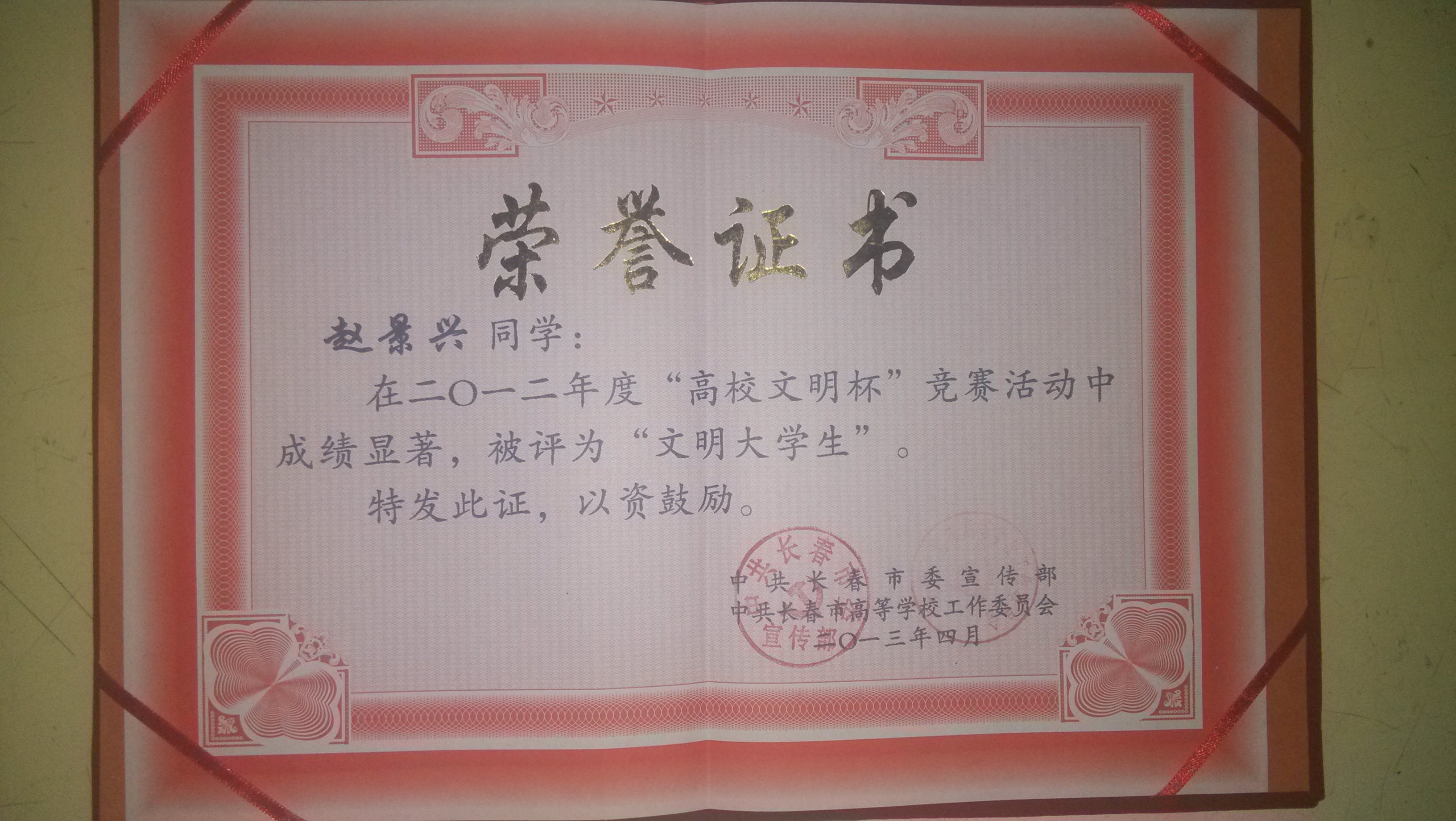 公司赵景兴获长春市“高校文明杯”竞赛活动文明老员工荣誉称号<