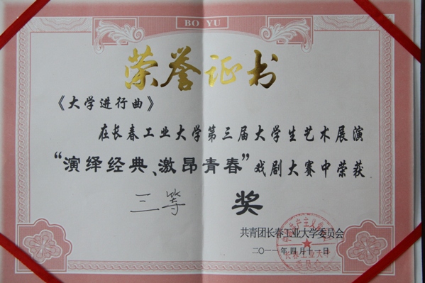 公司选送的《大学进行曲》、《梦想召回现实》获得tyc522cc太阳成集团第三届老员工艺术展演系列活动之“演艺经典•激昂青春”戏剧大赛决赛三等奖、优秀奖。