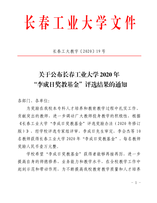 喜报:公司王世荣老师获得tyc522cc太阳成集团 2020 年“李成日奖教基金”