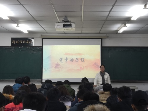 本次党课题为“党章的历程”。王丽娜书记讲述了中共一大至七大期间党章在革命战争中诞生,逐渐走向成熟,中共八大至十一大期间党章在探索中曲折前进,中共十二大到十九大期间党章在改革开放新时期不断完善的光辉历史进程,由浅入深、由表及里把此次党课推向高潮。新党章是一个继往开来、与时俱进的党章,体现了中国共产党人的探索与创新,凝聚了中国共产党人的智慧与心血,是全党意志的反映和全党智慧的结晶。王丽娜指出:十九大党章的修改充实了关于党的建设总体要求,对党员、党的基层组织、党的干部提出了新要求。