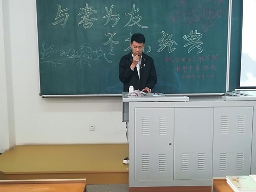 活动伊始,歆航书友协会会长王翠婷致辞,她鼓励同学们阅读经典,传播经典,并作为第一个讲述人讲述读书的意义,读书的好处。她以龙应台《目送》中“我”与家人的遇见与离别,分享了从书中人物的人生经历所获得的人生感悟。接下来现场同学纷纷上台,畅谈自己的读书感悟与心得。王秀娜以《追风筝的人》中阿富汗少年的兄弟情谊和背叛,讲述了感受到的人生的跌宕起伏;蔡杰以幽默风趣的语言介绍了《武则天传》中一代女皇的传奇的一生;随后,高宇航推荐了《影响力》、《平凡的世界》等经典名家之作;王广贯和胡彪魁分别推荐了《你是人间的四月天》《人间词话》诗集,使现场所有同学深刻体验到诗词独特的魅力;赵荣灿通过《儒林外史》《醒世恒言》,展现了经过漫长岁月所不变的经典古代文学的璀璨思想。活动最后,歆航书友协会副会长张洪亮作总结发言,他建议同学们要热爱读书,多读好书,不断努力提高人生阅历和个人修养,并希望能有更多的同学参与阅读经典的活动中来,弘扬经典,不忘经典。