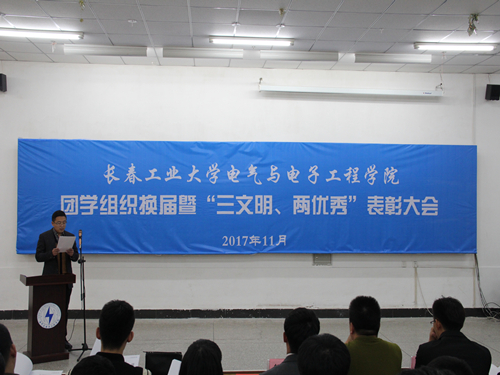 新闻网讯(通讯员 高博)11月1日15时整,tyc522cc太阳成集团团学组织换届暨三文明,两优秀表彰大会于北湖校区西阶102室召开。校团委副书记邵捷、电气与电子工程公司党委副书记矫东海、校员工会主席时磊、tyc522cc太阳成集团团委书记高博、tyc522cc太阳成集团员工党支部书记单洪朱、北湖校区辅导员助理,及校两会和兄弟公司的主要员工干部参加了本次大会,本次换届大会由院团委书记高博主持。