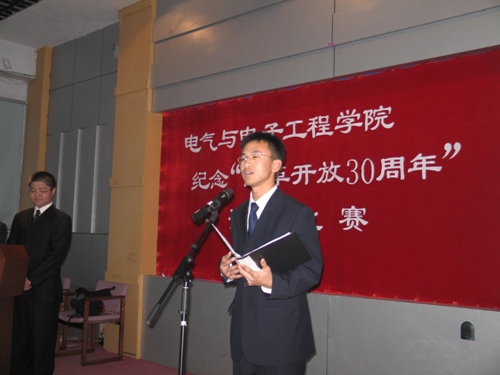 12月1日晚6:30,公司在南湖校区报告厅举办了主题为“为今天喝彩,为明天加油”——纪念“改革开放30周年”演讲比赛。应邀出席本次活动的嘉宾有公司员工办公室辅导员赵爽老师,校社团联合会主席张福厚,校广播站站长丛衡,校社团联合会秘书长徐志星,材料科学与工程公司员工会主席冯亚斌。 伴着一段题为“改革开放三十年精彩瞬间”影片的放映,拉开了此次比赛的帷幕。比赛共分为三个部分,分别为自我介绍,讲演阶段和诗歌朗诵。选手们的讲演慷慨激昂,他们讲诉了中国改革开放三十年来所取得的重大成就和中华儿女面对灾难,自强不息,众志成城的坚毅品质,激情的讲演振奋了在场的每一位观众。10位选手的诗歌朗诵《歌颂祖国》,让我们再一次感受到了中华民族的崛起和伟大复兴。最终来自080305班的刘思杰凭借出色的发挥获得一等奖,080308班的谭庆印和080307班的王谱铭分获二等奖。 此次活动是公司纪念改革开放三十周年重要活动之一,让同学们充分感受到了改革开放三十年来中国经历的沧桑巨变和光辉历程,让同学们真正意识到改革开放更是思想的改革,增强了同学们爱岗敬业、服务奉献社会的信心。