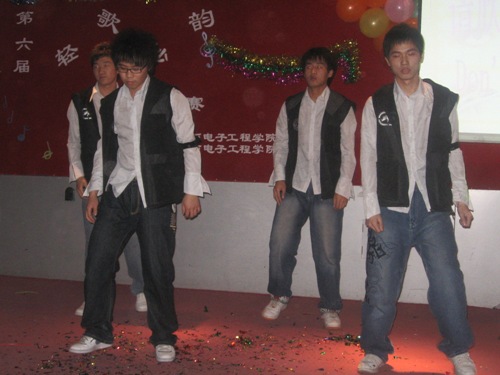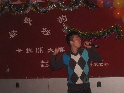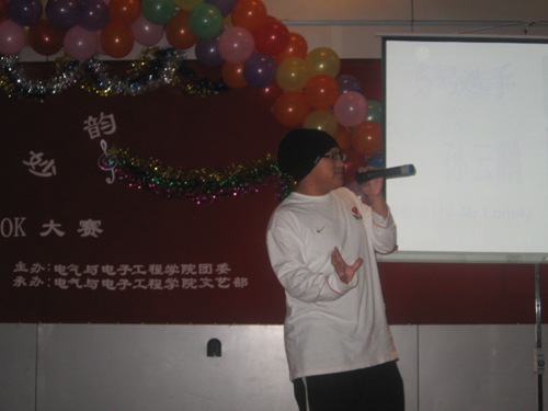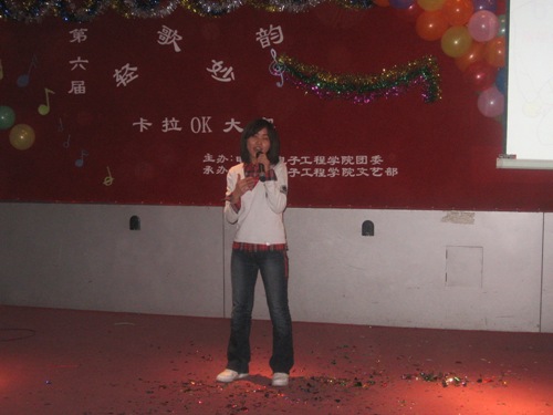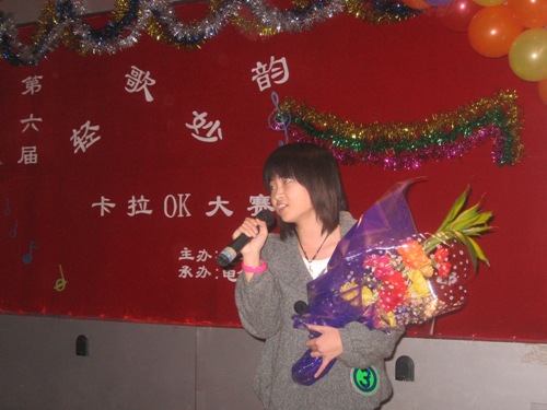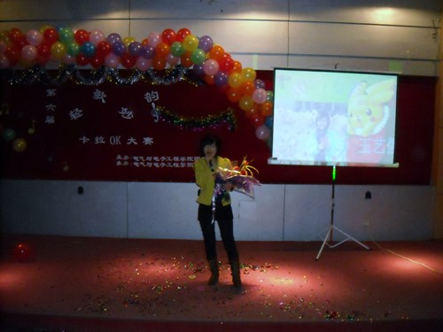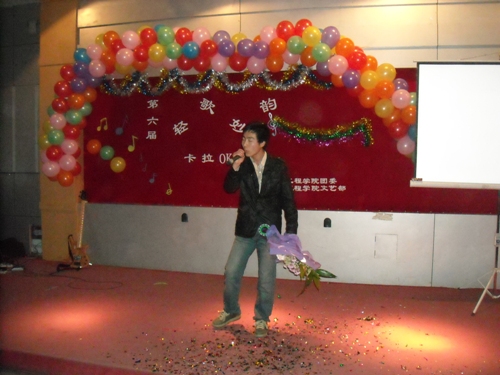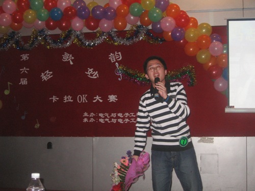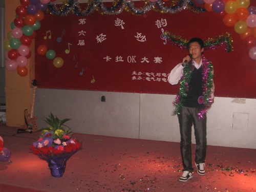 在富有浪漫情调的动画中十名参赛选手纷纷亮相。紧接着,参赛选手们分别演唱了《爱不爱我》、《你》、《听海》、《是非题》等歌曲。其间,董丰嘉、朱成龙、金多和张书瑜同学带来了舞蹈《DON’T PUSH》也为比赛的选手减轻了稍许的紧张。特别是《晚秋》、《倒带》等歌曲别有风味,博得了同学们的热烈掌声。为了活跃现场气氛,电气艺术团同学为观众表演小品《八戒闹天宫》,热情和幽默的演技引来了同学们的阵阵喝彩。比赛现场场面异常的热烈,各个亲友团更是使出浑身解数为选手们呐喊助威,最终080307班何亮以浑厚的嗓音,精湛的舞台技艺征服了现场的评委并获得第六届“轻歌妙韵”卡拉OK大赛一等奖。